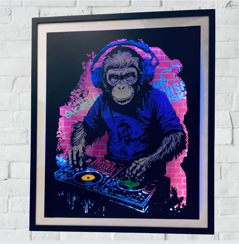 Lit up by vibrant LED lights, the frame pulsates with energy, adding an unforgettable ambiance to any space. Whether you're a music lover or an art enthusiast, this unique creation is sure to captivate and inspire. Bring the party home with our DJ Monkey LED Frame and let the beats and colours take centre stage!