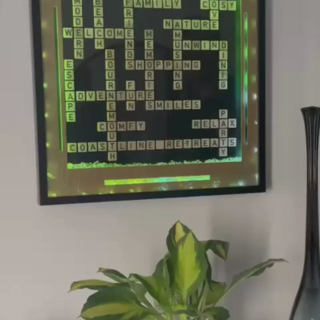 This eye-catching illuminated Scrabble-style frame was originally designed for Coastline Retreats – a bespoke holiday let business – and features themed words like family, unwind, adventure and escape to reflect the essence of a relaxing getaway. Surrounded by soft, colour-changing LED lights, it brings warmth and character to any space, making it ideal for Airbnb properties, guest homes, or business receptions.