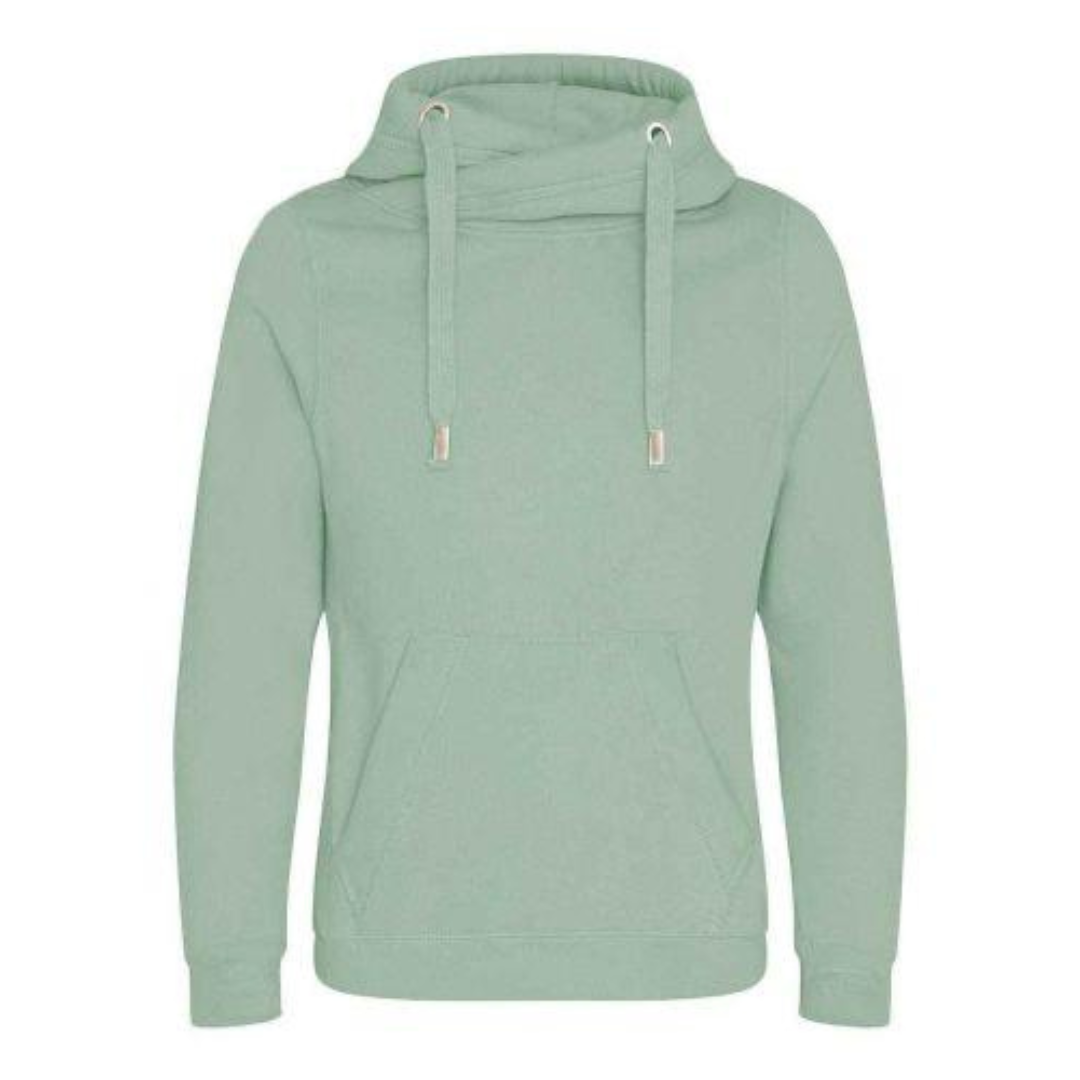 Heavyweight hoodie. Cross over neck detail. Twin needle stitching detail. Three panel double fabric hood. Flat lace drawcords. Kangaroo pouch pockets. Ribbed cuffs and hem. Soft cotton faced fabric created ideal printing surface. Brushed inner fleece. Thumb holes in the cuffs.