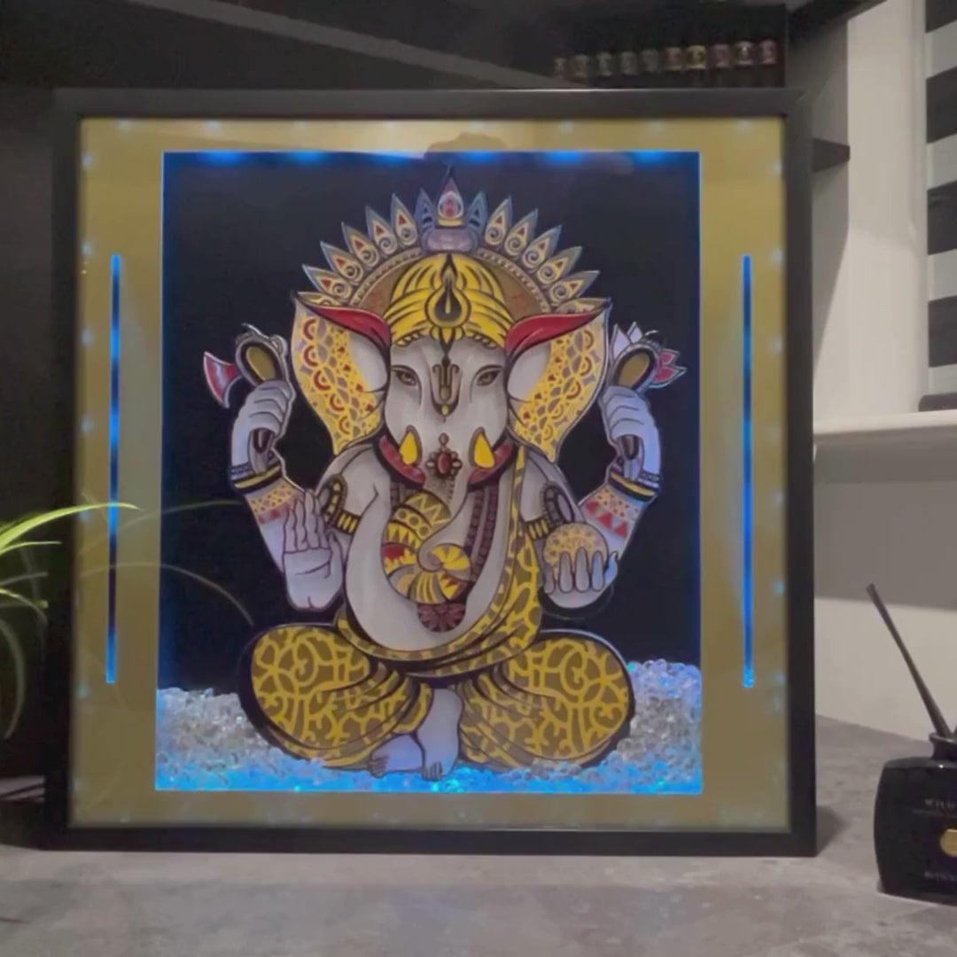 Illuminate your space with the divine presence of our captivating 3D Ganesh LED-lit frame, adorned with sparkling crystals! Measuring 50.8cm x 50.8cm, this enchanting masterpiece adds a touch of whimsy and spirituality to any room.