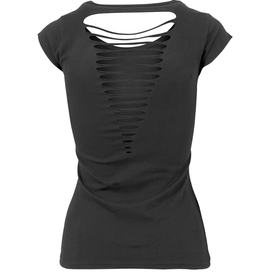 The Women's back cut tee is a feminine shirt with cool v-shaped cut-outs in the back. A large rounded scooped neckline and short sleeves complete the look.